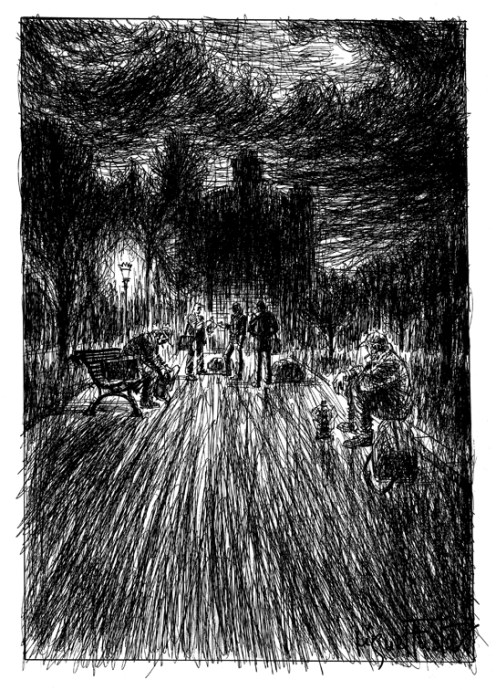 Pero, las luces de las farolas del parque muestran con cruel evidencia el sombrío semblante de nuestros pesarosos rostros. Su luz, prolonga la sombra interminable y alargada de nuestras lejanas culpas. Sin redención posible aguijoneamos nuestro corazón con sentimientos por infamias y pecados inconfesables.