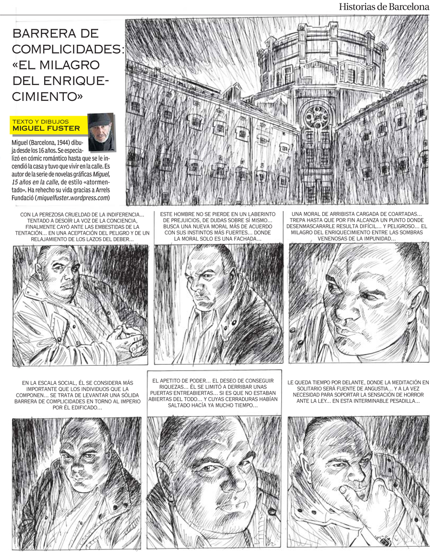 En la última viñeta publicada en el periódico 20Minutos Miquel Fuster habla sobre un enriquecimiento que tiene por base la corrupción. El derribar de puertas que conllevan a la pérdida de la dignidad humana. Un inevitable final en solitario y la pesadilla de su «juicio» ante la ley.