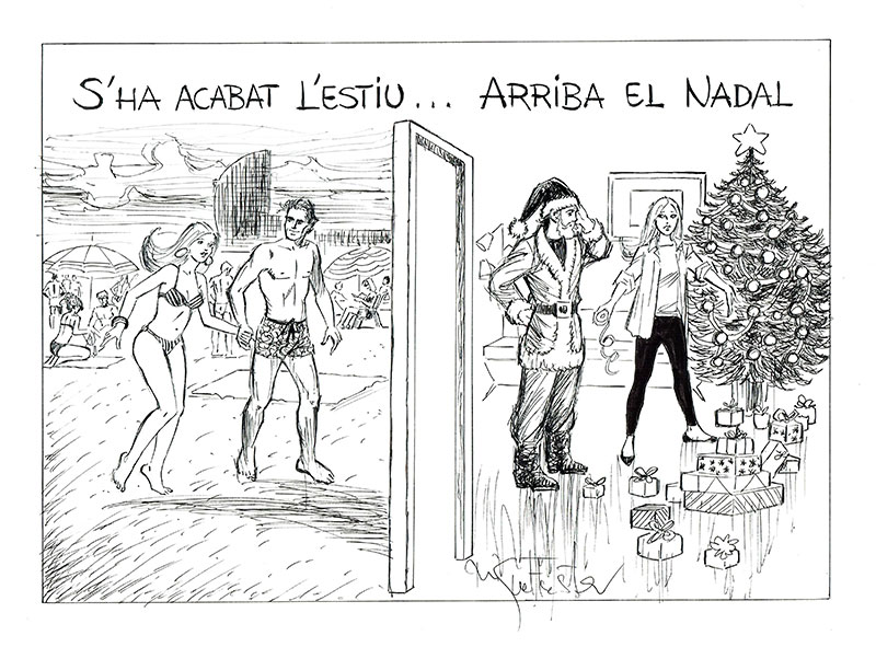 Siguiendo esta línea Miquel Fuster es uno de los invitados a colaborar con FAN para publicar periódicamente sus viñetas con temas variados y de contenido social. Os dejamos su primera colaboración despidiendo el verano y dando la bienvenida a la navidad que dentro de unos meses nos picará a la puerta.