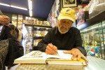 …y ahí estaba, casi escondido. Su gorra tapaba su cara. Las manos sobre su libro abiero en cuya hoja blanca iba dibujando trazos enmarañados dejándose adivinar poco a poco…un rostro…el suyo. Hipnotizada esperé mi turno. Elegí sin dudar: 15 años en la calle. Obra completa» de mucho peso moral y físico por las ilustraciones de las que el propio autor era protagonista y que yo, a hurtadillas, no podia dejar de mirar su frenética y mágica mano…Sabía que estaba frente a un GRANDE…estaba escrito en todo él.